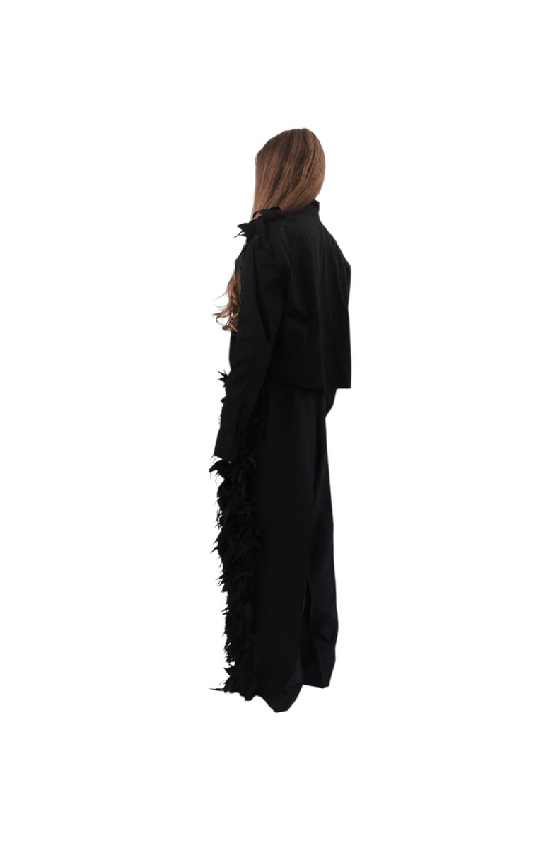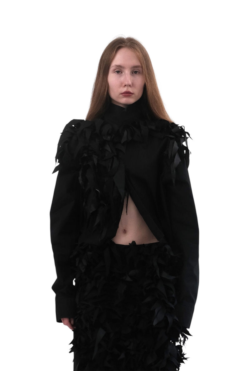 BLACK SCRAPS SHIRT to projekt stworzony z koszuli z drugiego obiegu urozmaicony o aplikację wykonaną ze skrawków i ścinek materiałów.