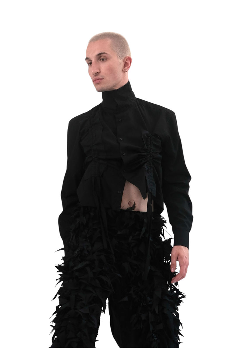 BLACK RUFFLED SHIRT to projekt unisex stworzony z koszuli z drugiego obiegu urozmaicony o regulowane marszczenia po obu stronach.