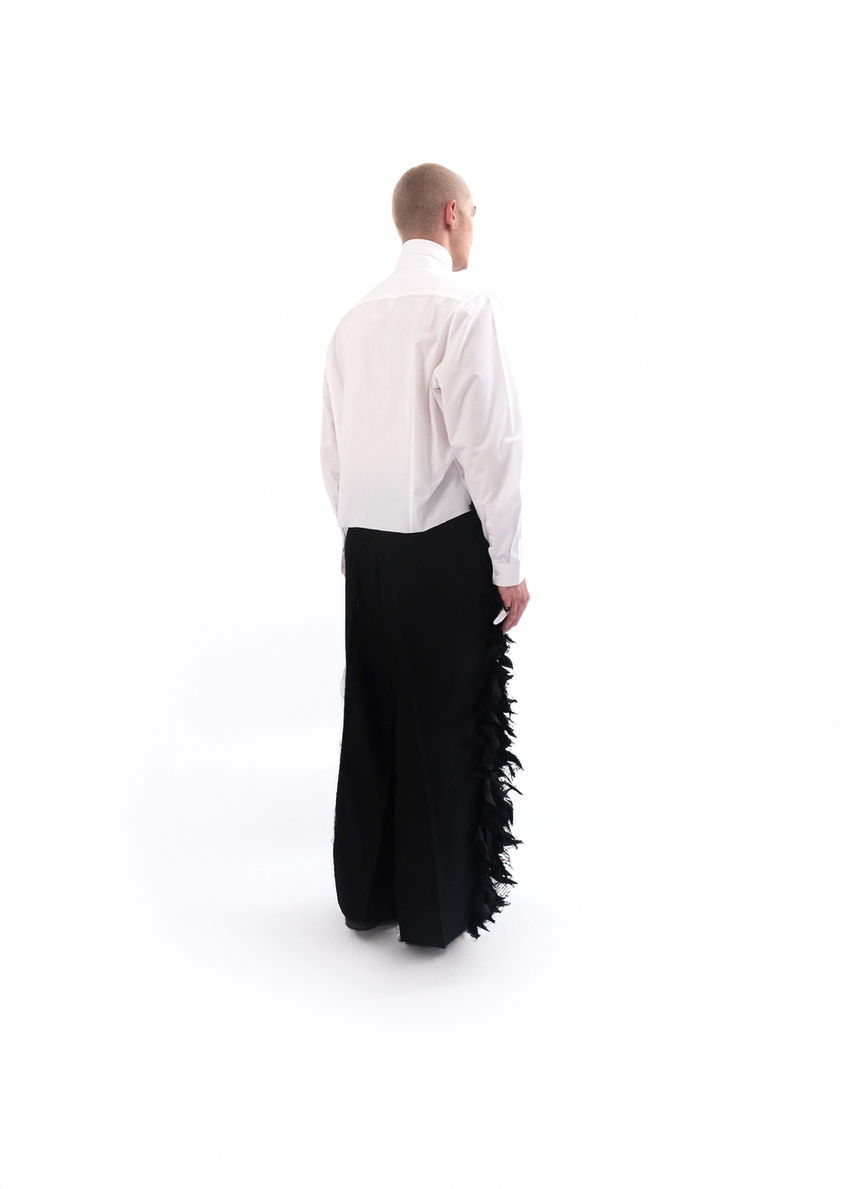 WHITE SCRAPS SHIRT to projekt unisex stworzony z koszuli z drugiego obiegu urozmaicony o aplikację wykonaną ze skrawków i ścinek materiałów.