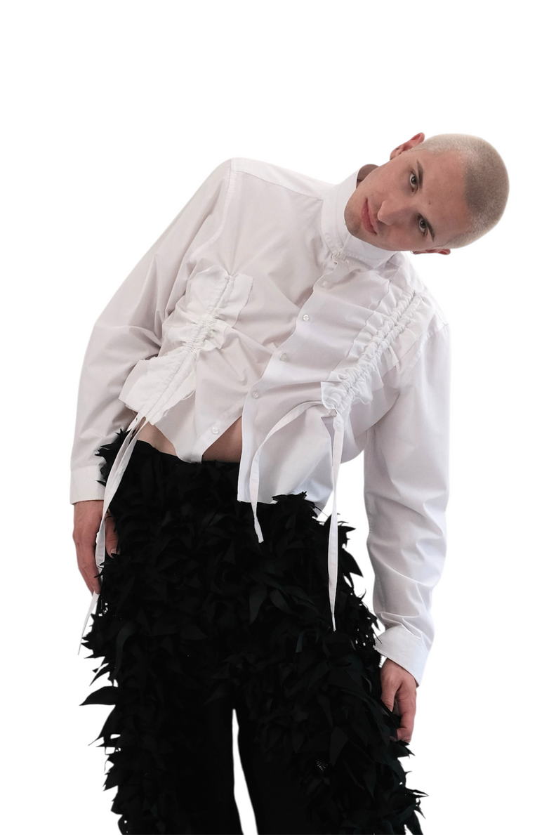 WHITE RUFFLED SHIRT to projekt unisex stworzony z koszuli z drugiego obiegu urozmaicony o regulowane marszczenia po obu stronach.