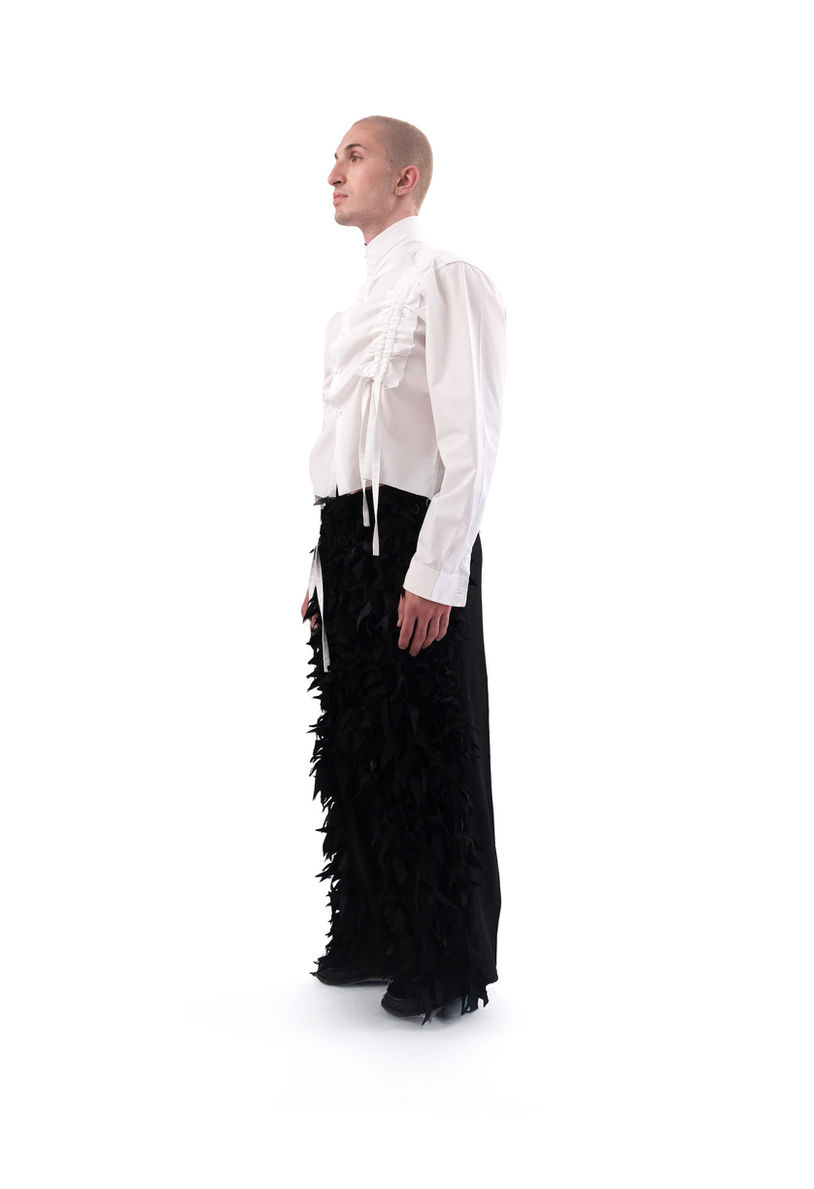 WHITE RUFFLED SHIRT to projekt unisex stworzony z koszuli z drugiego obiegu urozmaicony o regulowane marszczenia po obu stronach.
